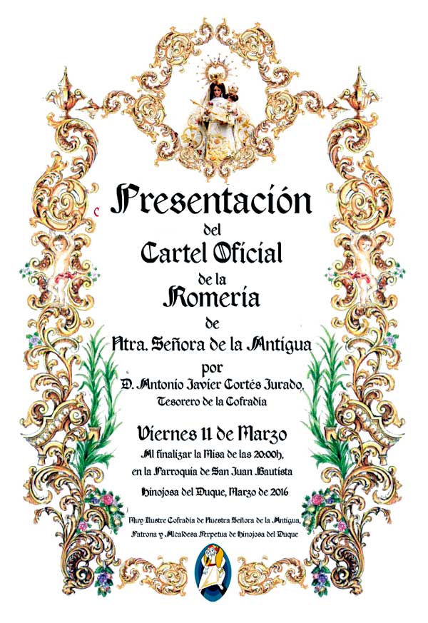 Acto de presentación del cartel de la Romería de la Antigua 7 marzo, 2016 Redactor Noticias 1 07-03-2016 La Cofradía de la Virgen de la Antigua de Hinojosa del Duque (Córdoba), anuncia para el día 11 de marzo la presentación del cartel oficial de la Romería del presente año 2016. Relacionado actividadesACTUALIDADcofradíasNoticias