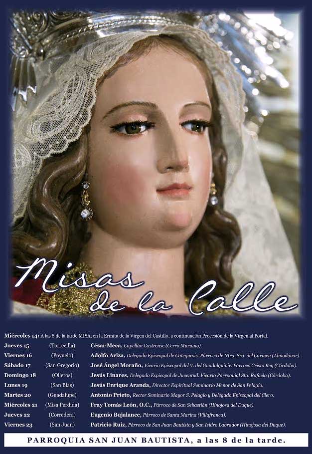 Hoy comienza la celebración de las Misas de la Calle, que a lo largo de de nueve días tendrán lugar, como cada año es de tradición, en el templo parroquial de San Juan Bautista de Hinojosa del Duque. Nueve Misas son las median hasta la Misa del Gallo en la noche del día 24 para esperar la Natividad del Señor. Cada día es una calle distinta la que celebra la Eucaristía, con la excepción del día 21, cuando la Misa la celebra la Parroquia por los difuntos, y recibe el nombre de Misa Perdida.