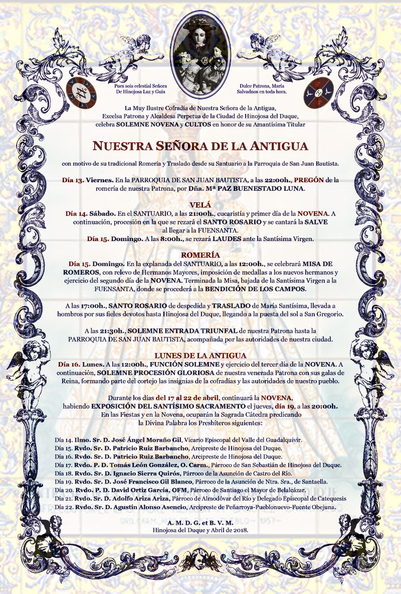 Programa de las Fiestas Patronales Antigua 2018 11 abril, 2018 Redactor Noticias 0 11-04-2018 Toda la programación de las Fiestas Patronales 2018 en honor a Nuestra Señora de la Antigua Relacionado actividadesACTUALIDADcofradíasFIESTA RELIGIOSAFIESTAS PATRONALESHINOJOSA DEL DUQUETRADICIONES