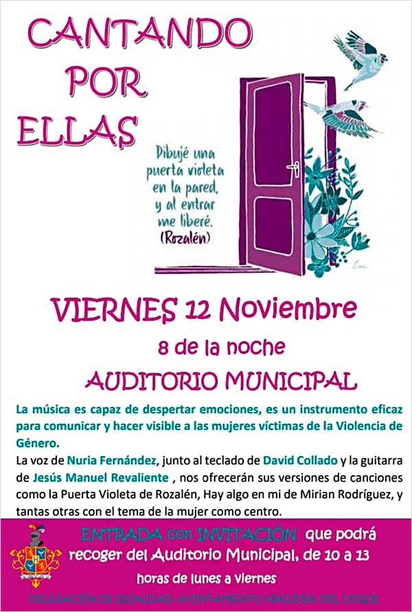 Dentro de las Jornadas contra la Violencia de Género organizadas por del Delegación de Mujer e Igualdad del Ayuntamiento de Hinojosa del Duque, el próximo viernes 8 de noviembre en el Auditorio Municipal de la localidad, se presentará el espectáculo musical «Cantando por ellas»